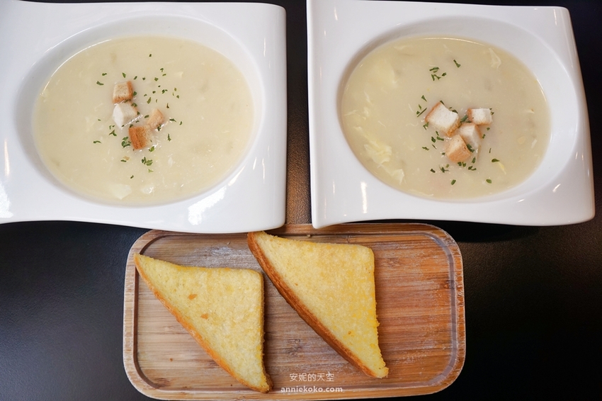 每份排餐均會附上濃湯以及奶油吐司。