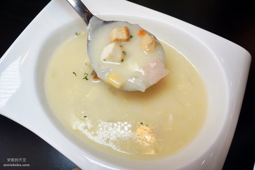 洋蔥火腿玉米濃湯份量頗大,濃湯裡配料不少,還有脆口的土司丁,熱呼呼的湯品喝起來滑順濃郁。