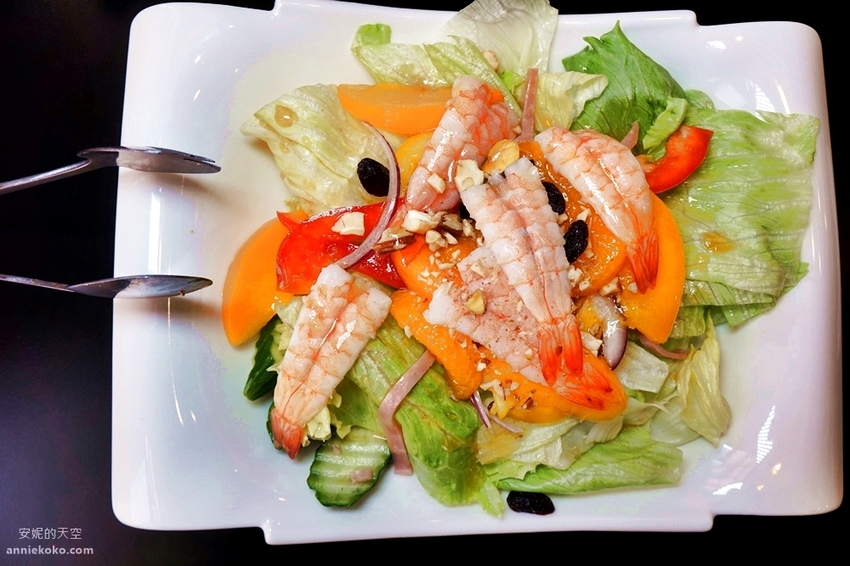別小看這一盤不到100元的季節時蔬沙拉,中午不想吃大餐的女生點一份來吃也很可以,裡頭時蔬有羅曼、黃瓜、紫洋蔥、彩椒以及火腿條,蔬果非常的多樣性,還搭配了水蜜桃與柑橘,加上鮮甜彈牙的鮮蝦,一整個吃完很滿足呢。