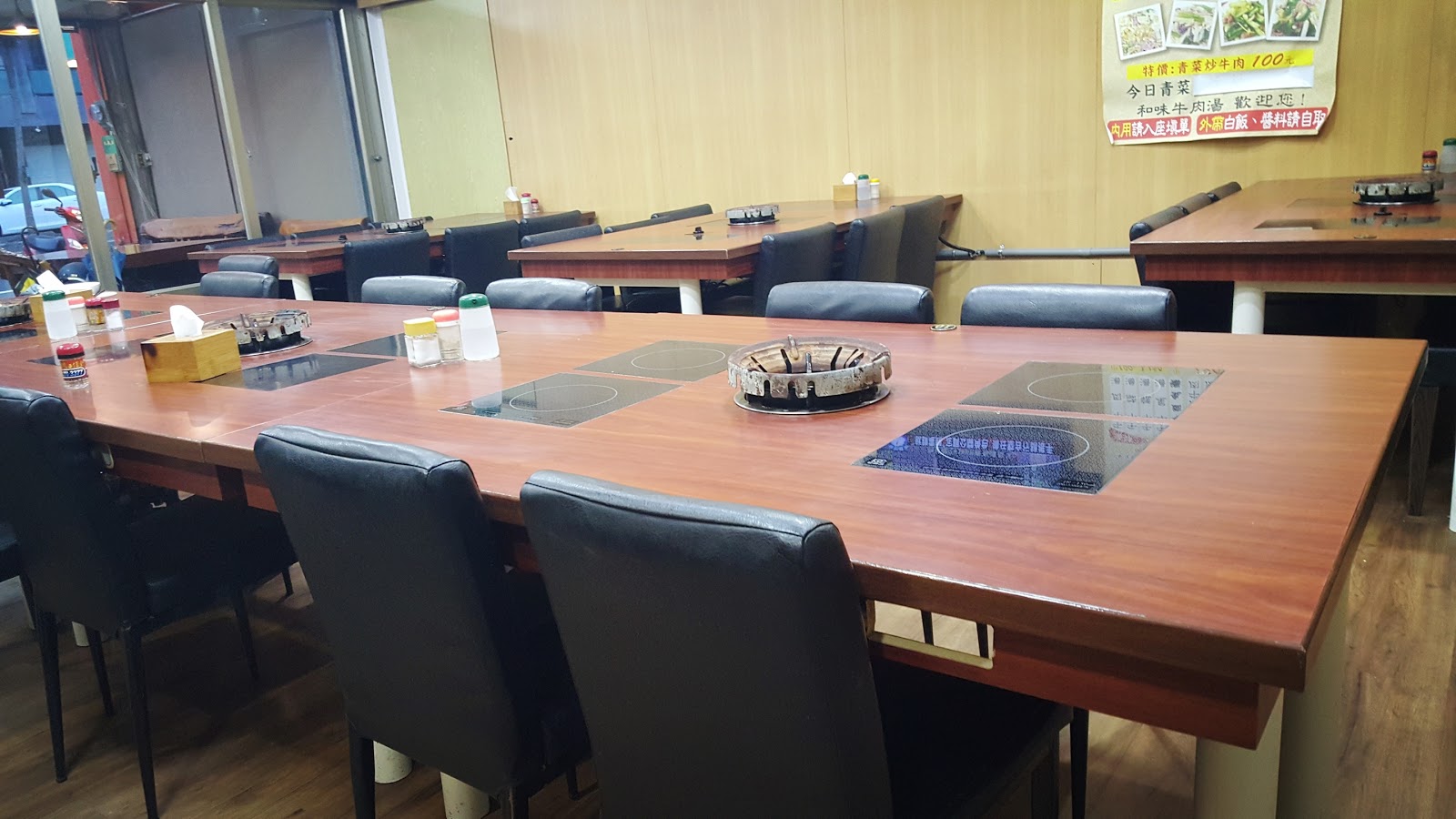 店內乾淨明亮,除了牛肉湯還有賣火鍋,所以桌上有瓦斯爐和電熱爐。大部分是六人桌座位,中間有一排連著的長桌有十幾個座位,如果人多聚餐,這樣坐一桌也滿熱鬧的。