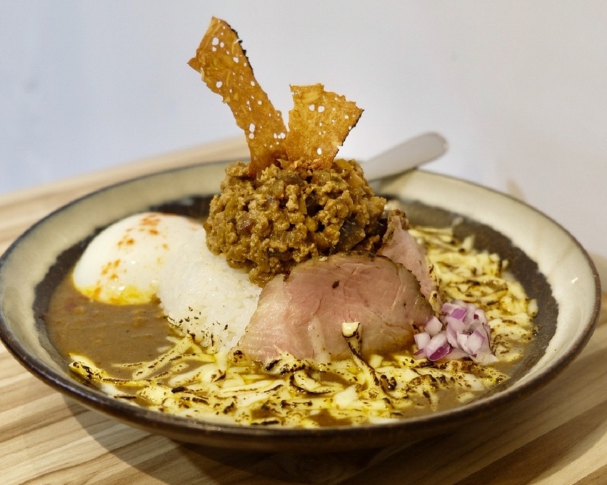 將拉麵的豚骨高湯,加入辛香料熬煮成濃郁咖哩