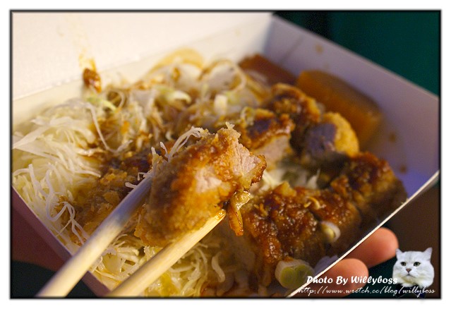因為同伴人數龐大,所以單點豬排邊走邊分享;這是味增醬腰內肉豬排,高麗菜給的相當多,一旁還有兩塊醃漬蘿蔔,豬排相當鮮嫩,味增醬就是一般豬排沾醬,以60元的豬排來說有超水準表現,C/P值相當高。