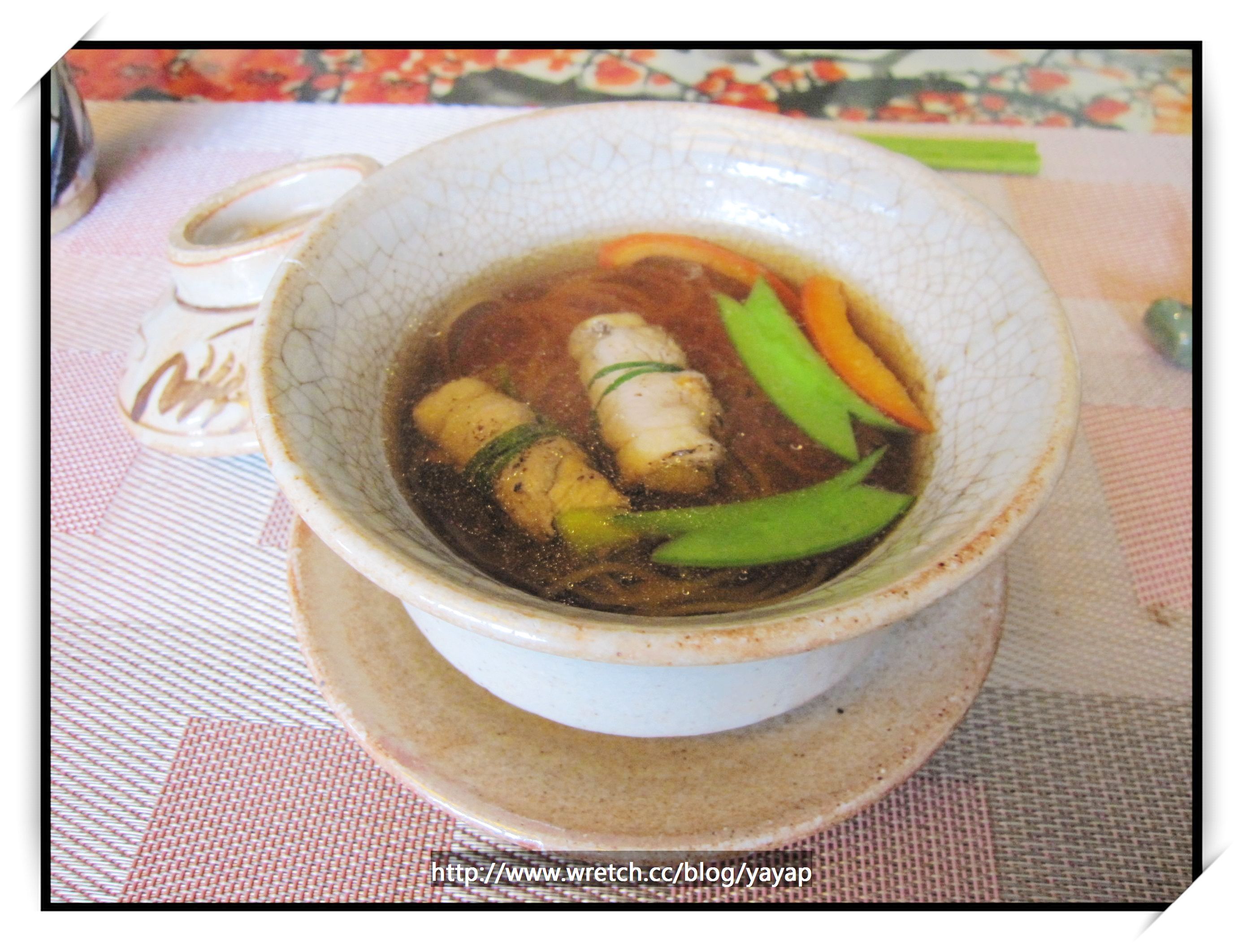 這道碗盛是日式手工麵、日式高湯及宜蘭櫻桃鴨捲三星蔥。