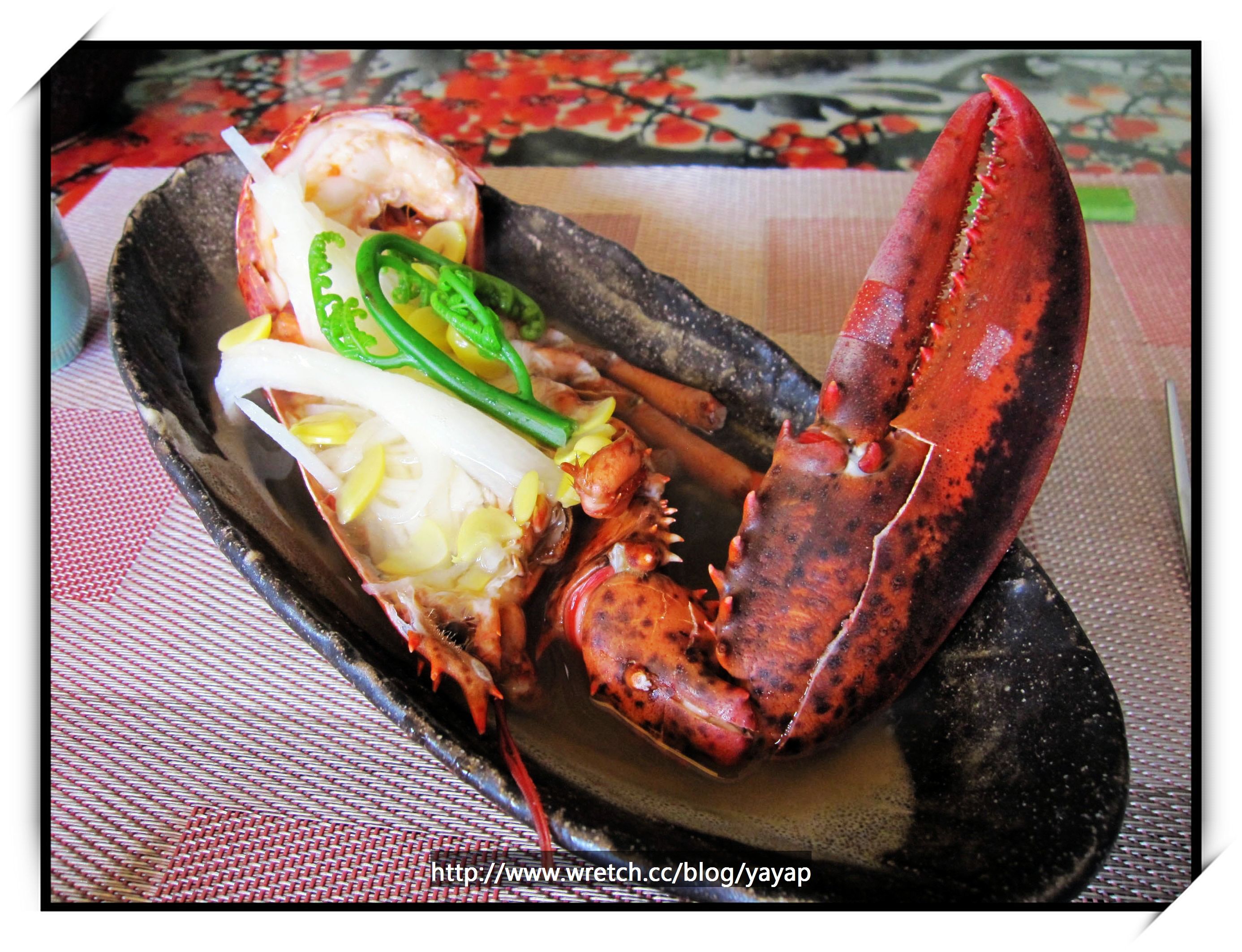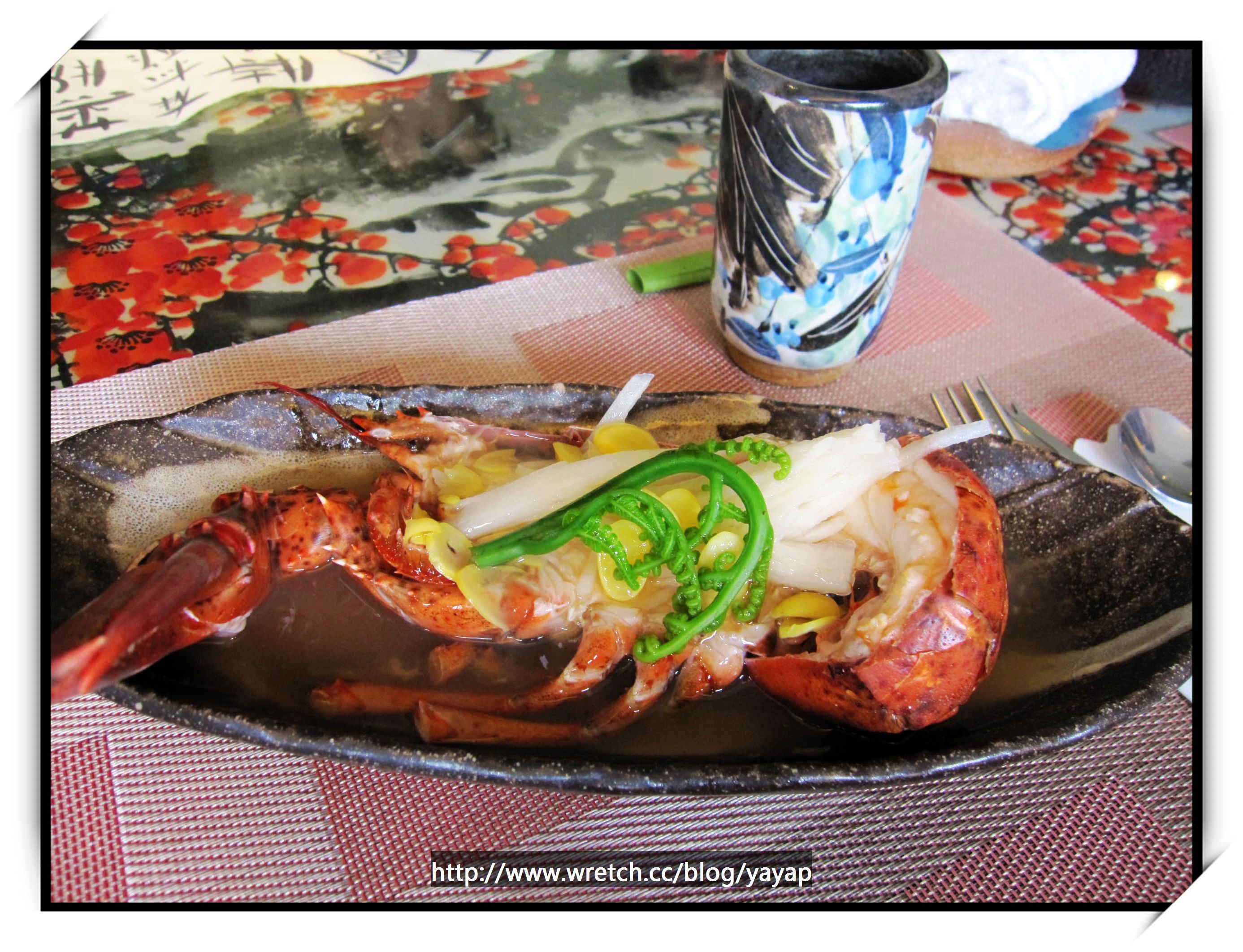 一大隻龍蝦直接端上桌,上面是日本山藥、白果及過貓。