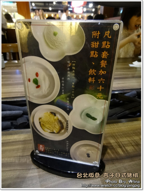 甜點選擇有:哇莎米冰淇淋、岩鹽冰淇淋、手作杏仁豆腐、咖啡鮮奶布丁、日式豆奶布丁