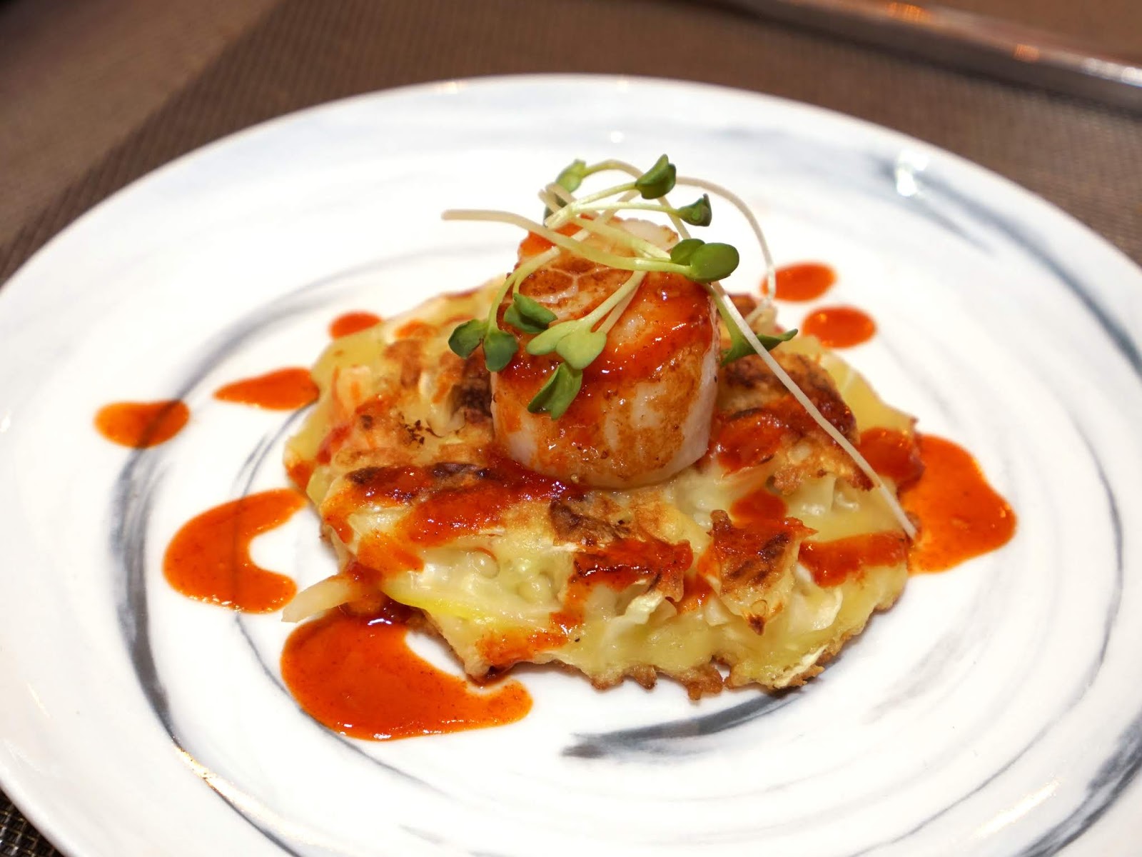 商業套餐的前菜還有這道韓風海鮮煎餅,剛剛打卡送的干貝就在這上面,生食等級的干貝,煎得外酥內軟,吃起來非常嫩口。