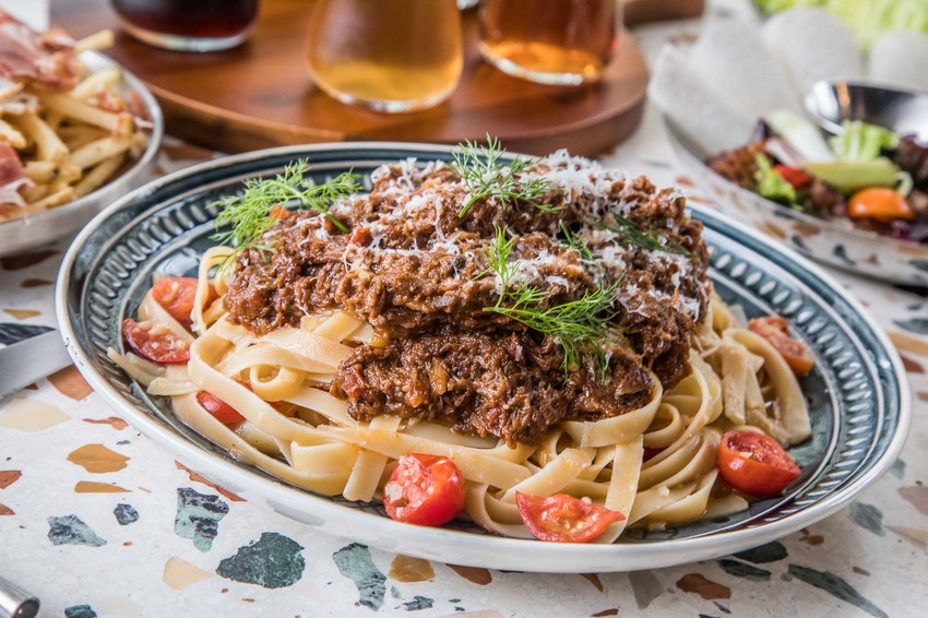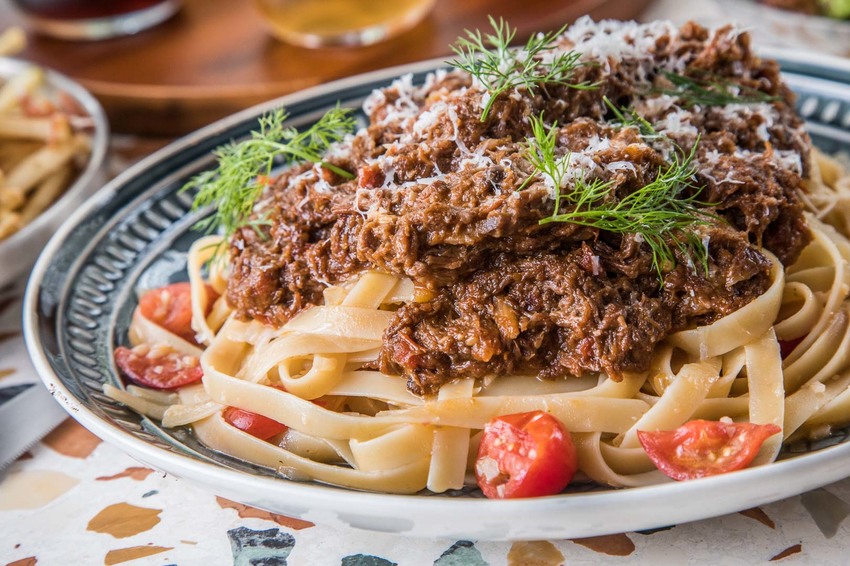 金磚牛小排肉絲麵真的很狂,除了義大利寬麵是手工麵外,上面看似肉醬其實是牛小排燉肉剝成絲!