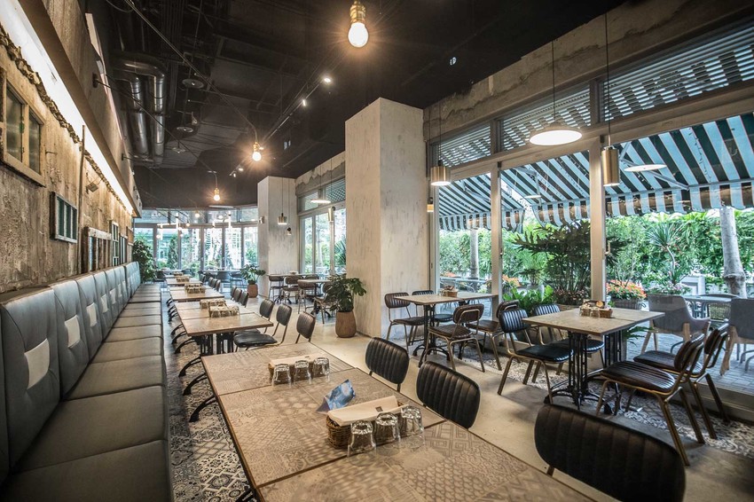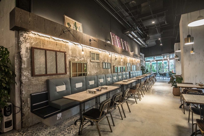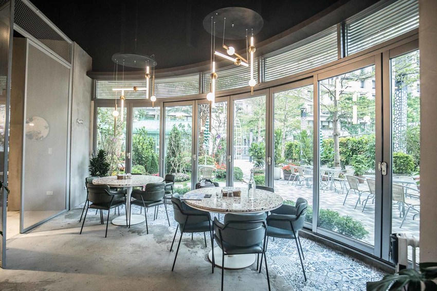 除了吧檯區的用餐區,再往裡走別有洞天,後方是明亮寬敞的用餐區,旁邊的落地玻璃引進外面的自然陽光,加上外頭的綠意盎然造景,有種身處森林玻璃屋中的氛圍,左邊是一排的沙發區,牆上復古斑駁的造型很是搶眼,注意到了嗎?餐桌上花紋像是不同花紋的歐洲壁磚的感覺