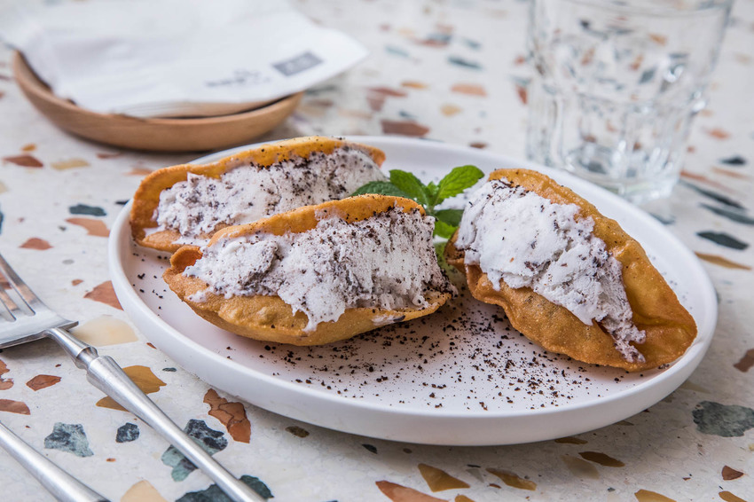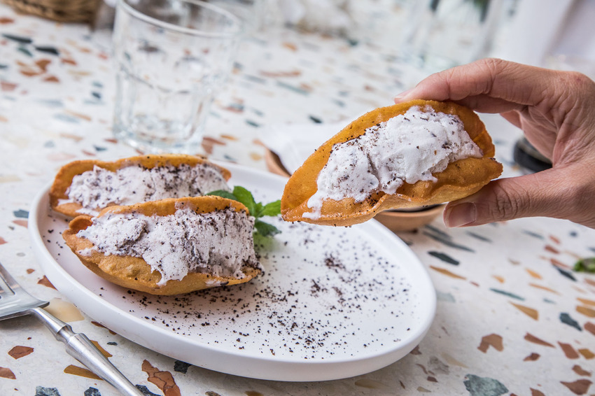 酥脆的塔可餅包著巧克力香草冰淇淋,酒足飯飽再來份甜點,足矣!