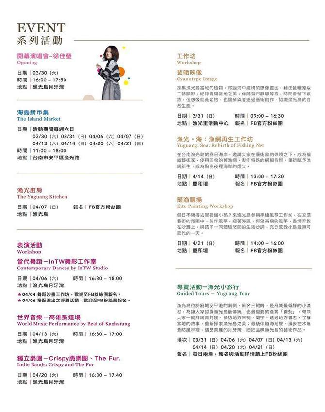 開幕演唱會-徐佳瑩、每週六日的海島新市集、當代舞蹈、世界音樂、獨立樂團演出以及漁光小旅行。