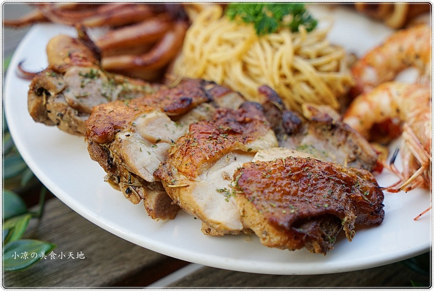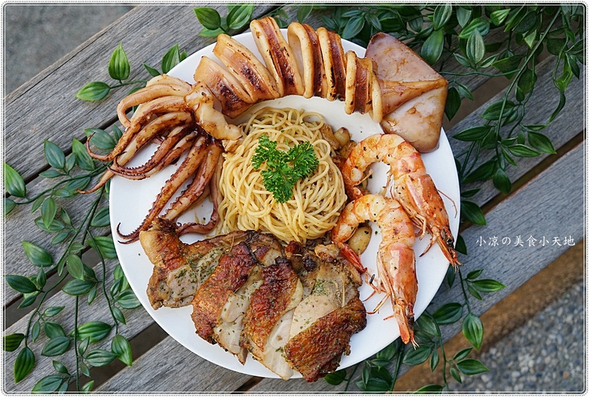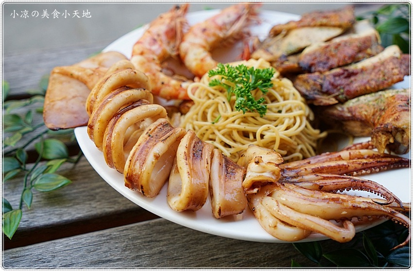 一整隻的新鮮魷魚和兩大隻的草蝦,一整塊雞腿排,海陸食材鋪滿整個義大利麵盤