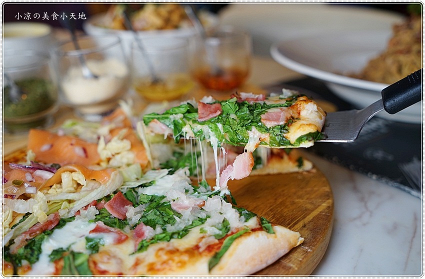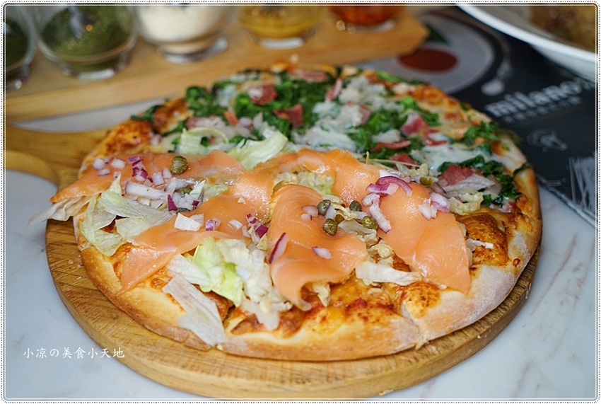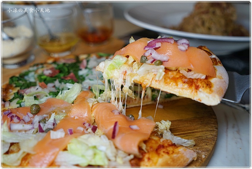 披薩可以單一口味或是雙拼(7選2),小凉選了香蒜培根菠菜起司披薩(季節款)、煙燻鮭魚起司披薩