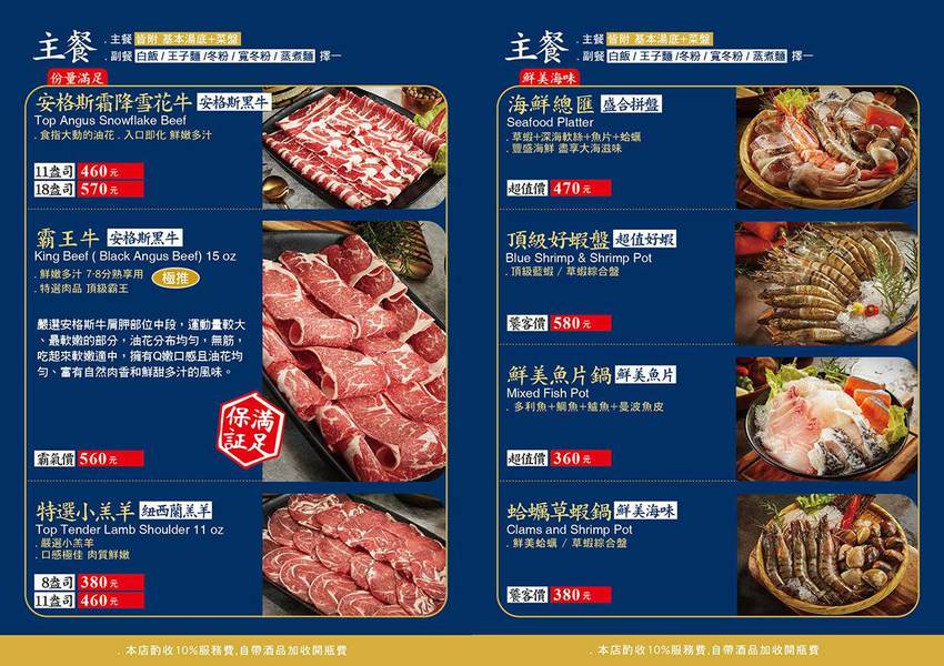 點餐的方式就是先選湯底再選主餐,每一鍋都有附菜盤及副餐五選一,店內主打平價高級肉品,為了讓客人能品嘗到一份好肉,肉片是採厚切(3-4.5mm)的方式處理。