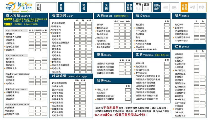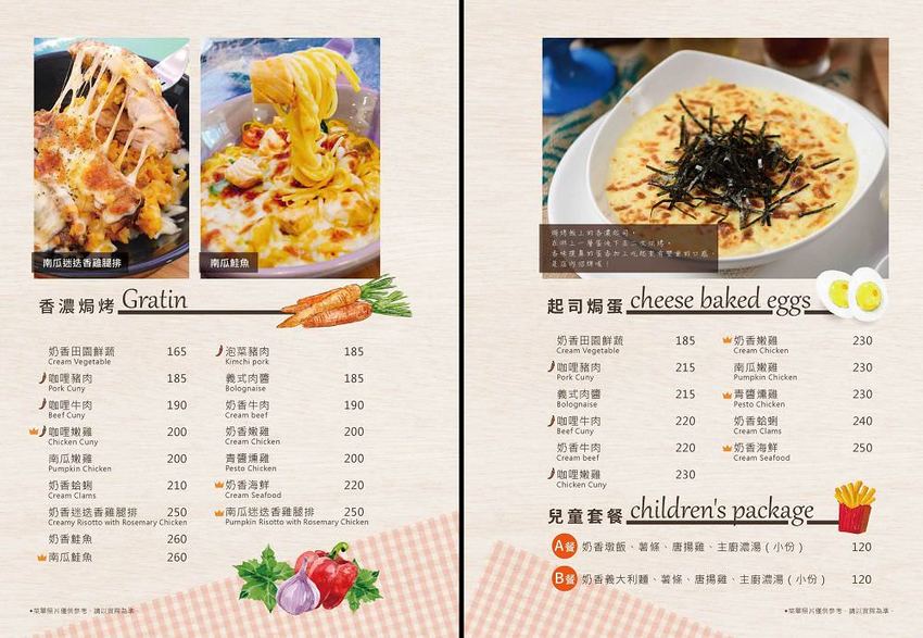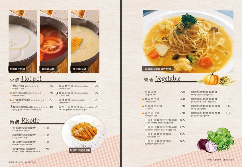 店家餐點滿多樣化的,有:義大利麵、燉飯、香濃焗烤、起司焗蛋、火鍋、鬆餅、點心、素食、咖啡、飲品!!!
