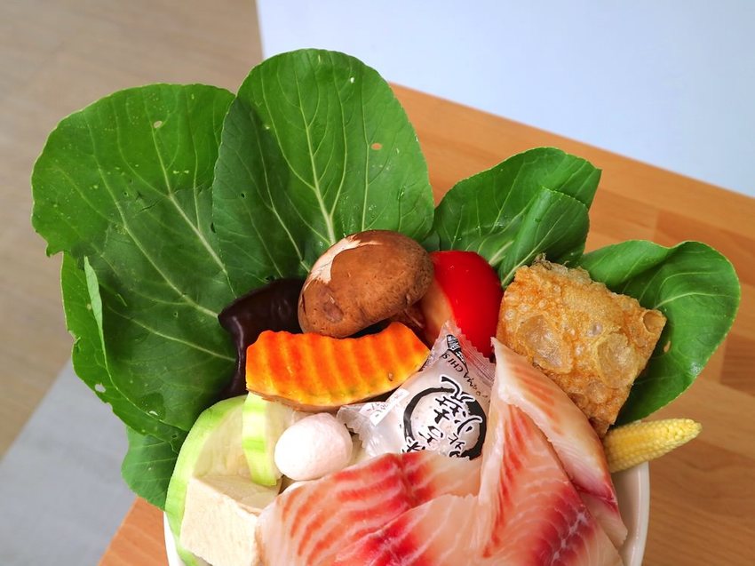 有各式新鮮蔬菜+火鍋丸餃+凍豆腐+豆皮…