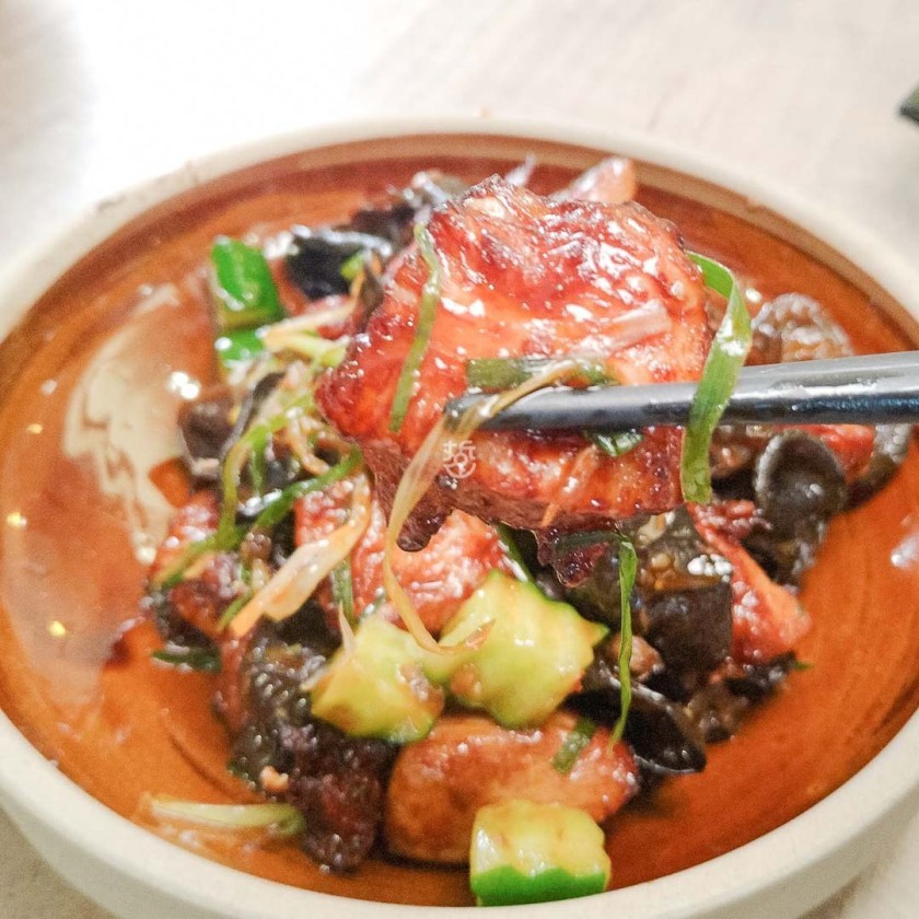 ↳這道是店家推薦的,是店內的人氣餐點,金黃色的雞肉搭配吸滿醬汁的木耳,配上輕脆的小黃瓜,我吃出有類似甜麵醬的口味。