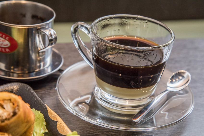粉享喫鍋也有提供多種越南特色飲品唷,說起越南飲品首推就是越南特色咖啡,越南冰咖啡是一種滴漏式的咖啡,使用專用滴濾杯,熱水悶蒸後慢慢滴落於裝盛煉乳的杯中,越南咖啡喝起來是甜味相當重,能品到濃郁香醇帶點微微酸香越南咖啡味,口味相當獨特順口
