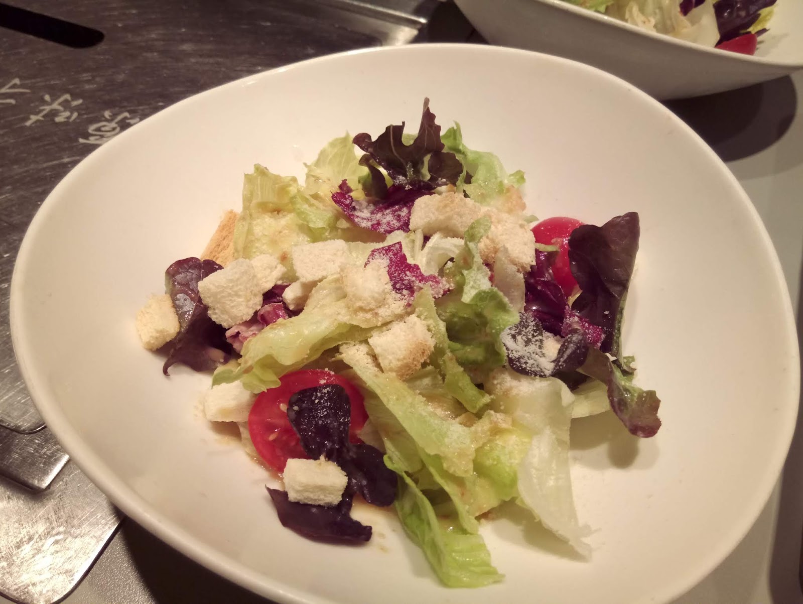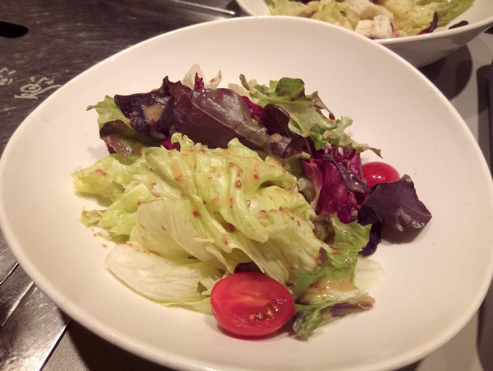 愛吃牛的我,當然就是點雙牛套餐,一開始會先送上沙拉,我們是選擇凱薩跟胡麻醬,個人比較喜歡胡麻的香氣,但原燒的凱薩醬也很特別,不是外面吃到的那種偏鹹凱薩。