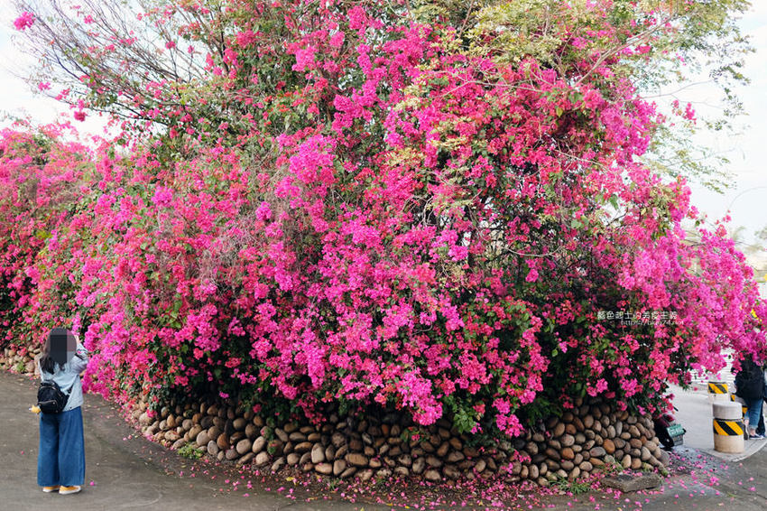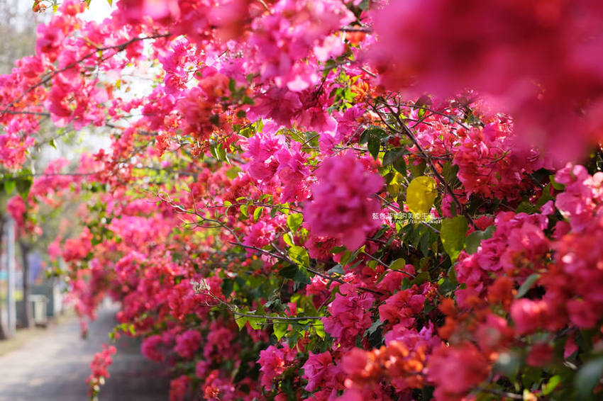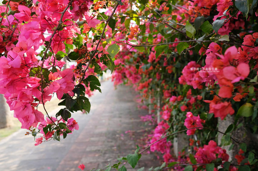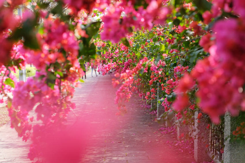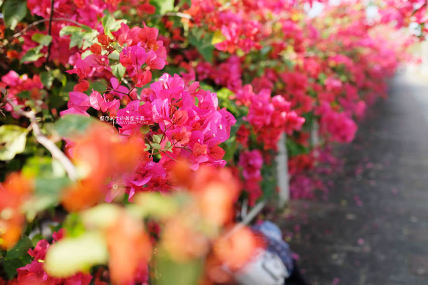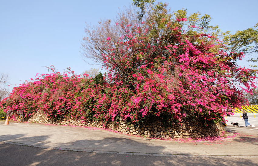 整排花牆延伸,怎麼拍背景都鮮豔火紅,吸睛程度可不輸櫻花阿