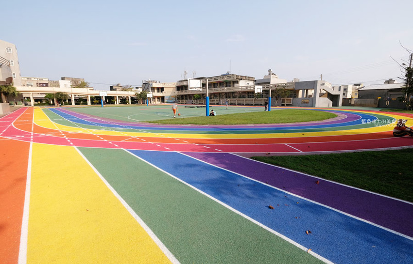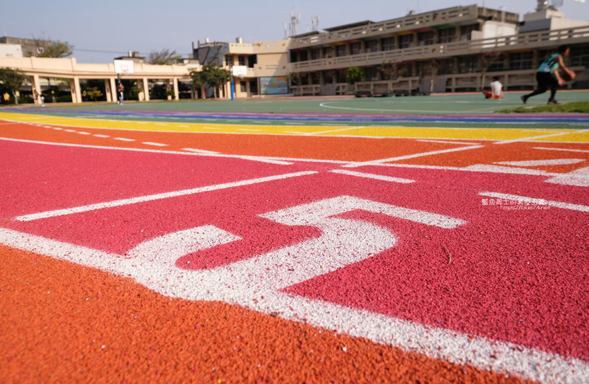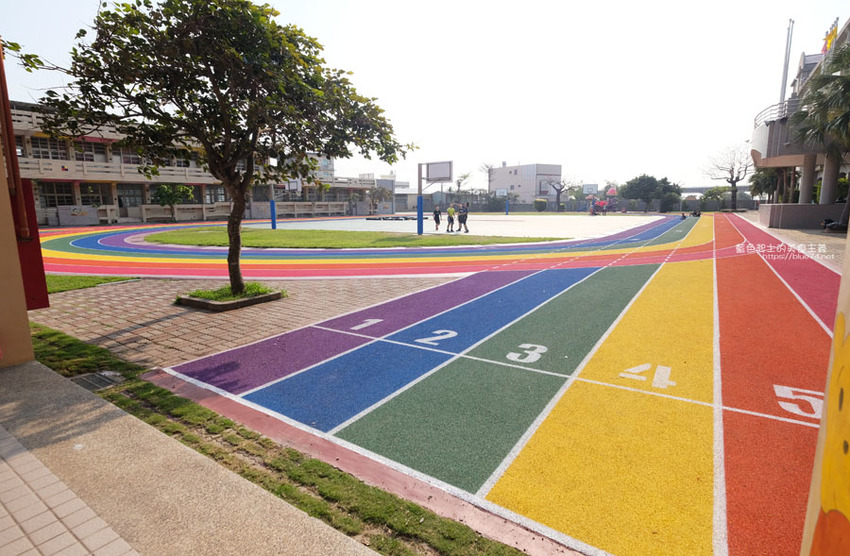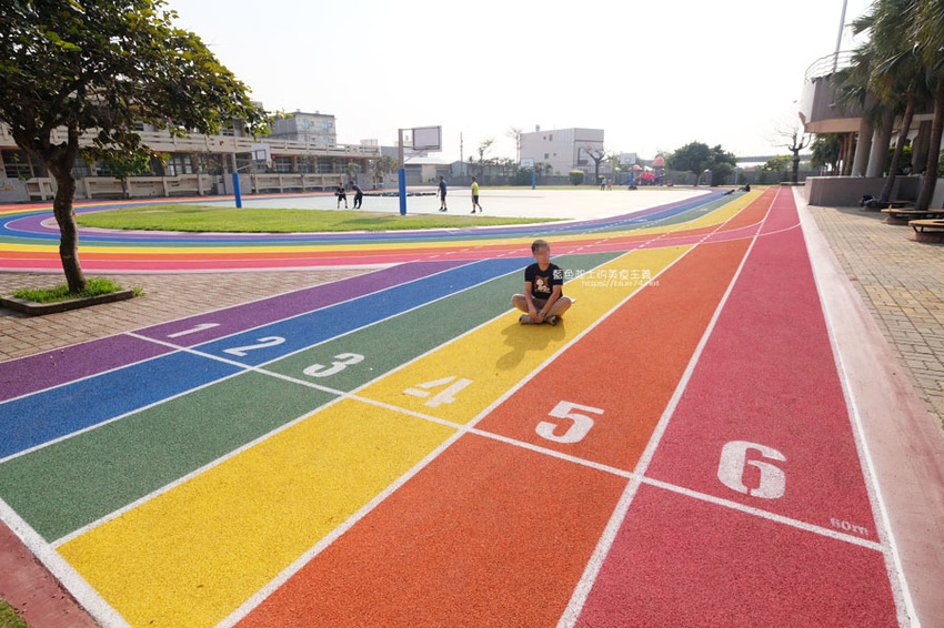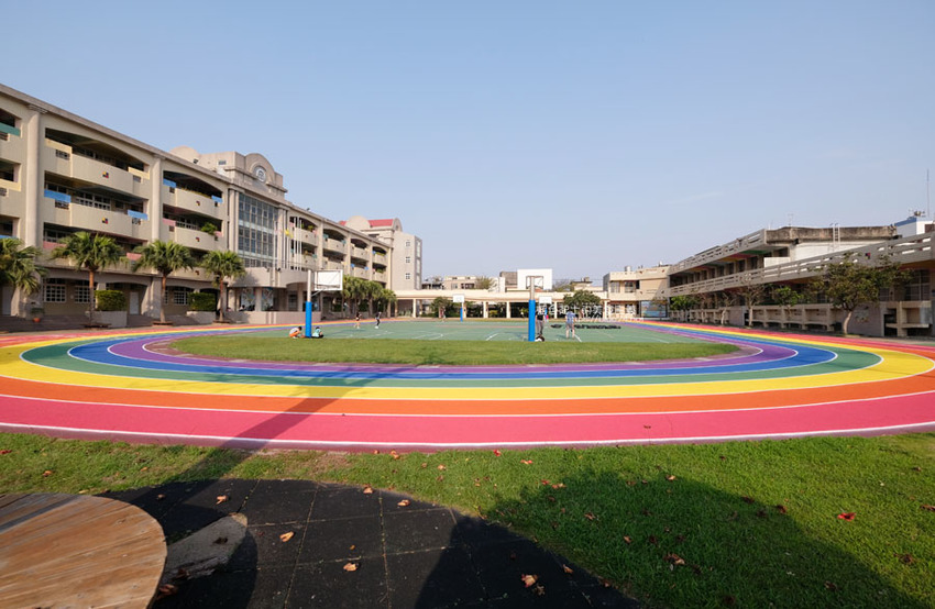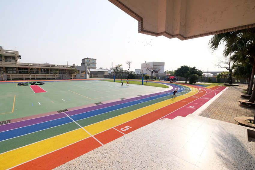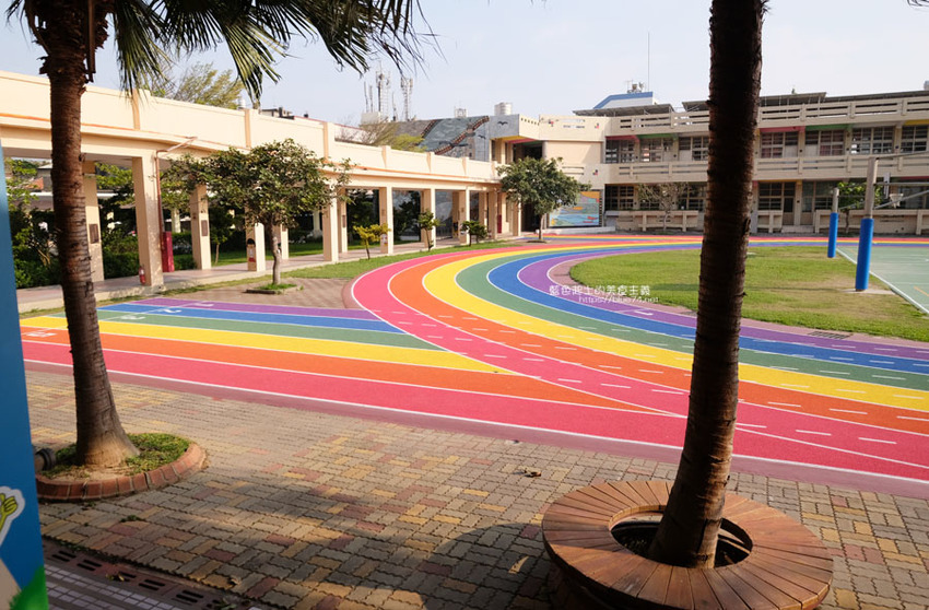 高美國小百歲囉,歷史悠久的學校,在校慶這天,操場繽紛、亮眼的彩虹跑道熱鬧的啟用