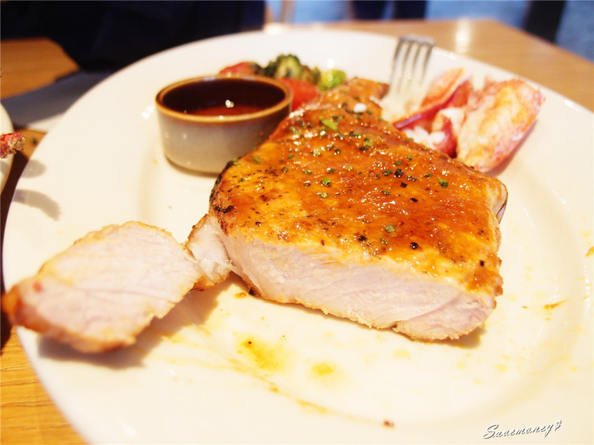 我們點的主餐沒多久就上桌了:波士頓活龍蝦和原木燒烤雲林帶骨豬排