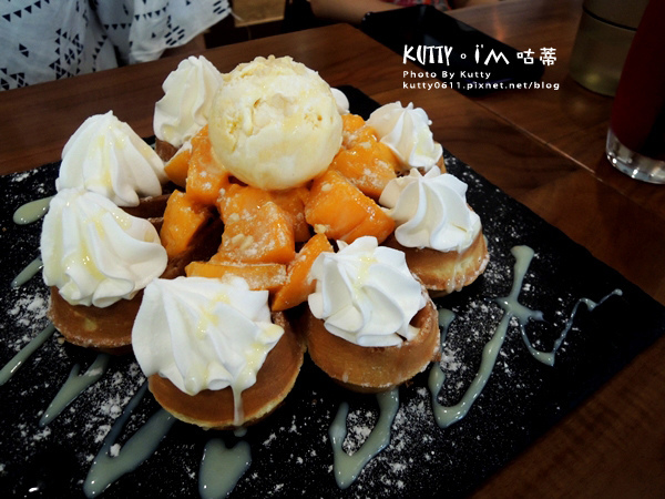 上面的冰淇淋也是抹茶口味一路抹茶到底~鬆餅裡面有麻糬也是一大特色