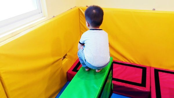 幼兒體能體操課開始上課前,先讓小孩來一下感覺統合小遊戲熟悉環境,二寶認真的觀望其他小朋友如何玩遊戲
