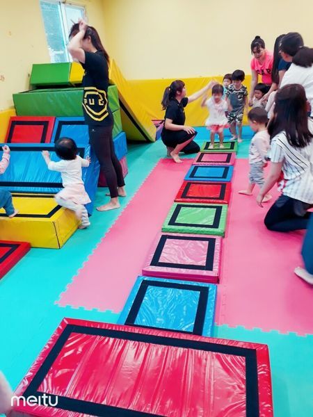 幼兒體能的體操第二節課程,轉換課程擺放地墊時,教練也會和小朋友互動,讓小朋友認識顏色絕無冷場。教練先試範兔子跳跳跳,皆著小朋友都很乖的排好隊一個接著一個跳,跳完就可以爬坡溜滑梯囉!
