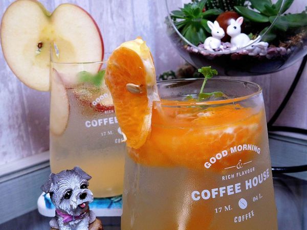 柚子果肉用蜂蜜蜜過 ,搭配上檸檬汁與冰水 ,上桌時搭配橘子片