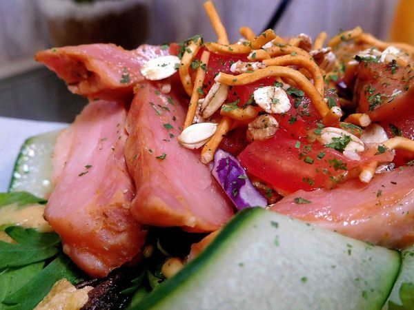 旁邊圍繞著的黃瓜片上面淋上了少量的油醋醬 ,最後撒上王子麵與穀物麥片增添口感