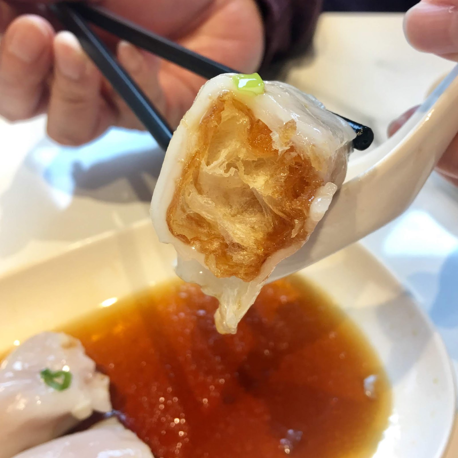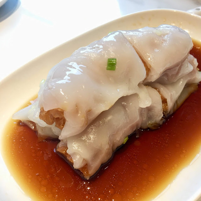 ■ 蔥花炸兩腸粉 - 吃飲茶必有點心之三,自從第一次在澳洲吃到香港朋友點炸兩就愛上這個口感,炸兩指的是油條,酥脆油條再配上腸粉與醬汁,口感超好吃,D22的腸粉晶透的口感,偏甜醬汁,再裹上粉腸真的很好吃!不會糊糊爛爛的~