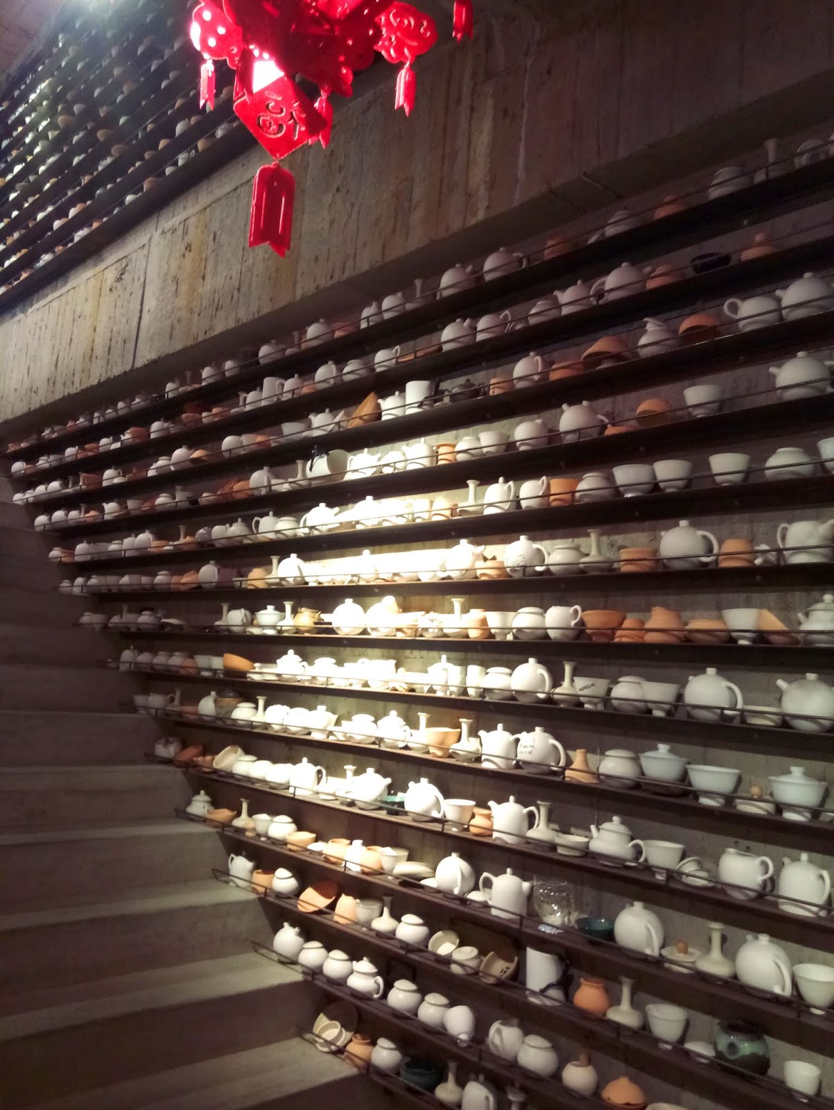 環境真的還不錯,雖然說是地下一樓,但或許是這裡地勢較低的關係,所以也不是那種密閉空間的地下室,還是有戶外風景可看的。樓梯牆邊還有一整片以當地陶瓷為主題的牆面放了好多茶壺呀。