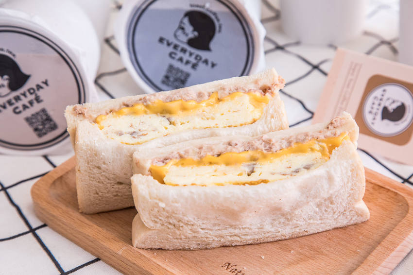 鮪魚蛋三明治一直是早餐店的看板三明治之一,EVERYDAY CAFE-永和頂溪店將鮪魚蛋再進化!一般的鮪魚三明治多半是鮪魚拌上大量的美乃滋,吃多了容易膩,EVERYDAY CAFE鮪魚餡料裡加了洋蔥丁跟蘋果丁,藉由洋蔥及蘋果自然的甜度及爽脆口感,中和美乃滋的膩感,吃起來格外清爽順口!