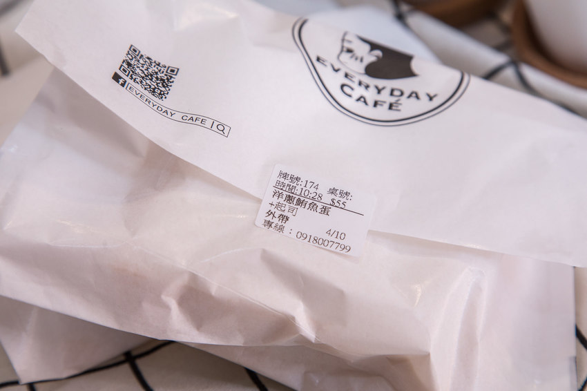 EVERYDAY CAFE吐司會用這種方便攜帶和拆開的防油紙袋包裝,上面也印有EVERYDAY CAFE的LOGO,接縫處也會貼上品名的貼紙,這種紙袋真的很不錯,一般普通的紙袋放了一段時間吐司就潮濕跟紙袋合為一體XD,遇到有醬料的吐司更是慘不忍睹,EVERYDAY CAFE的紙袋吃完吐司手還是乾乾淨淨的