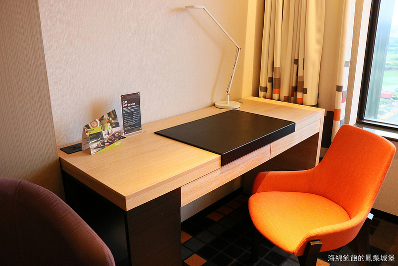 辦公桌的桌面很大,桌上有檯燈跟電源插座