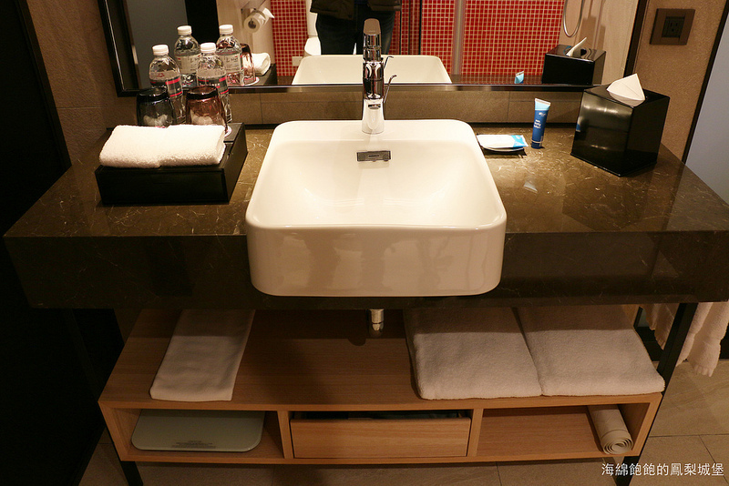 洗手台有盥洗用具、毛巾、衛生紙、護膚乳...等