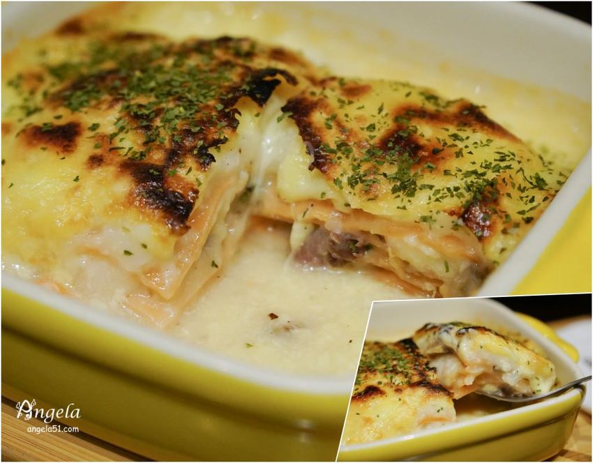 海鮮千層麵一上桌就有焗烤起司的香氣撲鼻,一層麵皮、一層海鮮配料再加層起司,口感層次軟滑中帶有紮實感。一口吃下的味道有海鮮巧達湯的風味,最上面的焗烤起司雖然微焦,但也沒失去焗烤的起司味道。沒想到,海鮮千層麵滿適口的,值得推薦。