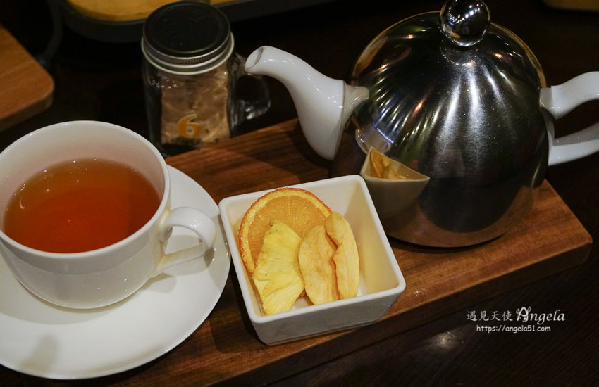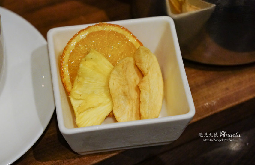 熱帶天堂茶飲,以紅茶為基底,有玫瑰花香味與水果的清淡風味,喝起來滿順口的。一旁附有自製的水果乾,蘋果乾香郁酸甜、鳳梨乾甘甜、柳橙酸甜有糖蜜,果乾都很好吃配茶更是絕配~