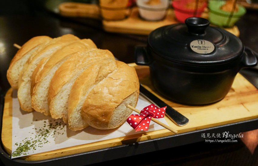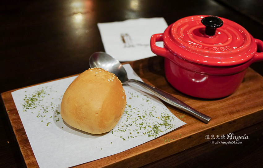 點主餐加購附的是南瓜湯,也可以補差額換其他湯品。南瓜湯喝的到南瓜的清甜風味,湯品不會太過濃稠,還不錯喝。一旁附的麵包看似普通,但其實口感軟彈中帶有實在感,滿好吃的 。沾著濃湯一起入口也很對味!