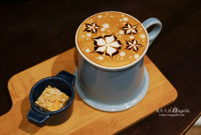 榛果拿鐵咖啡,店家的咖啡拉花可以指定,這美麗的咖啡拉花會讓人捨不得喝下它XDD。榛果拿鐵的咖啡香氣足夠,榛果醬也不會太甜,還不錯喝! 咖啡飲品還附有店家自製的棉花糖玉米片,棉花糖軟中帶有玉米脆片的脆感,不會甜膩,這小點心好食也滿配咖啡的。
