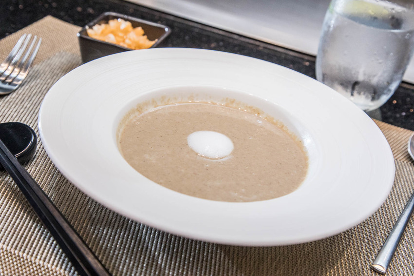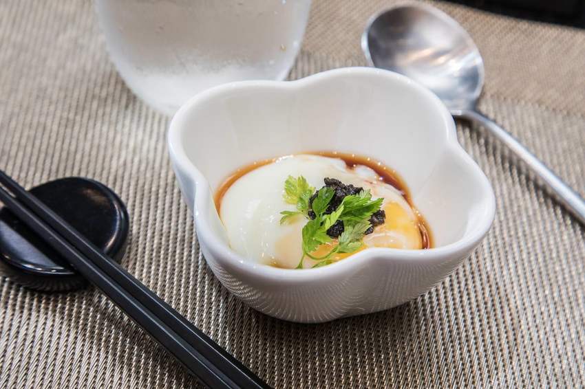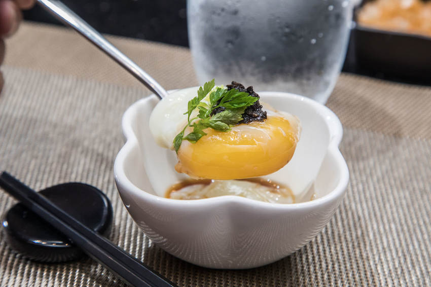 山茶花鐵板燒是以套餐方式呈現,從前菜、沙拉、主餐到甜點一套吃下來約莫2個小時,主廚先送上以低溫50度烹調的溫泉蛋,軟滑鮮嫩的溫泉蛋搭配的是頂級的黑松露醬,鮮香之間開啟食慾味蕾
