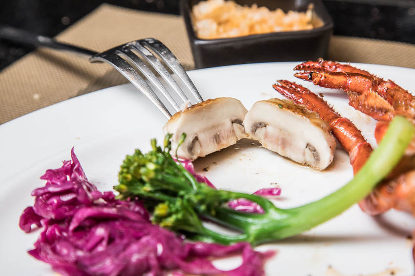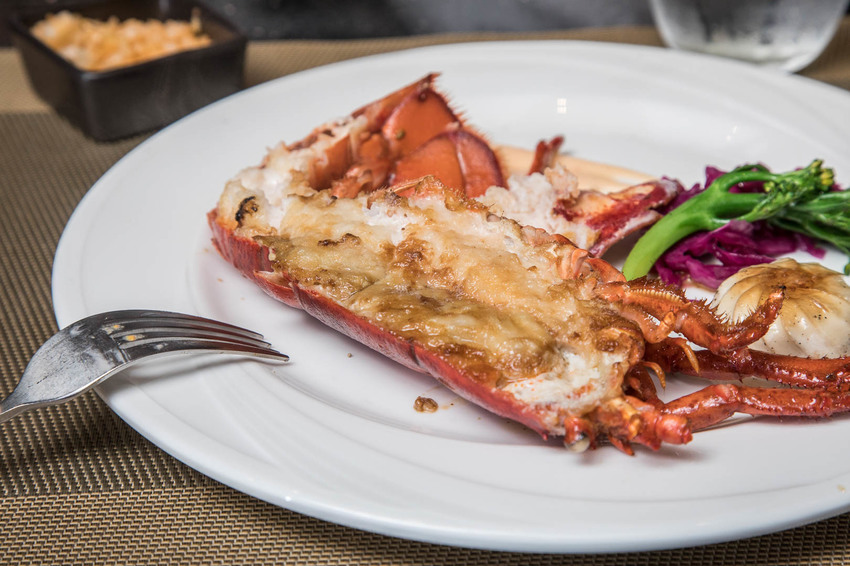 蝦身肉質超厚實!因為新鮮,龍蝦即使經過蒸煎鐵板料理後,蝦肉絲毫不縮水,蝦肉都快爆出蝦殼了,只要從龍蝦尾肉與殼中挑起一個小空隙,讓叉子可以伸進肉與殼之間就好,因為新鮮龍蝦肉很紮實,所以放心從殼裡刮挑吧,不用擔心蝦肉會散,輕鬆就撥下完整的龍蝦肉了!