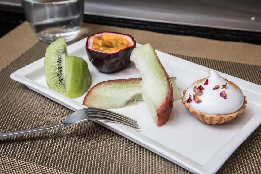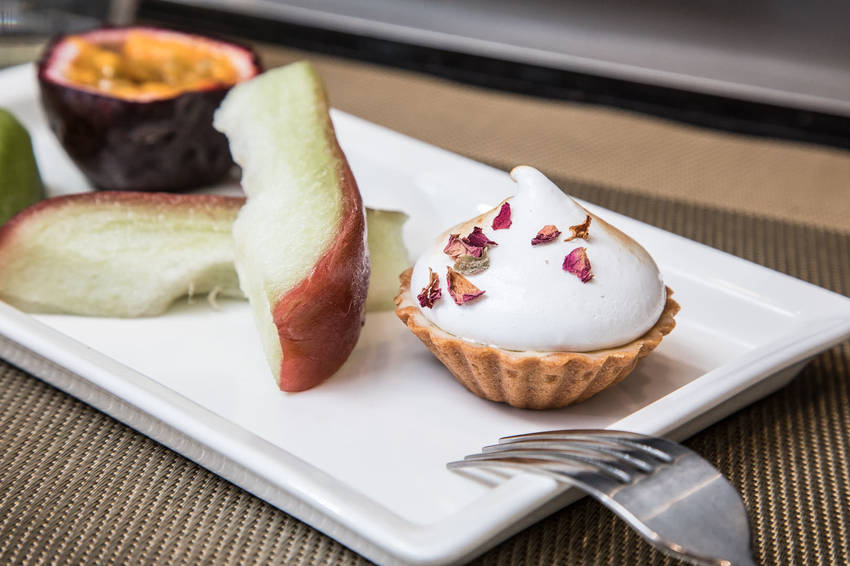 飯後水果及甜點,甜點是櫻花棉花糖塔,甜而不膩口感軟綿的棉花糖加上酥脆的塔皮,為這一餐畫下完美的句點