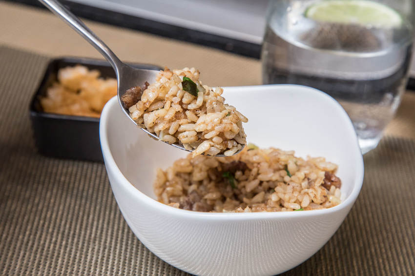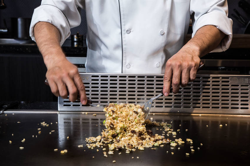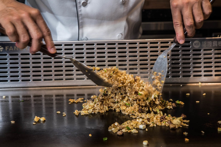 超奢侈用和牛來炒飯!和牛與洋蔥一同拌炒,米飯是先用蛋液混和透出金黃色澤,主廚快速地翻炒,香氣頓時飄散四周,米飯也像跳舞一般在鐵板上飛躍
