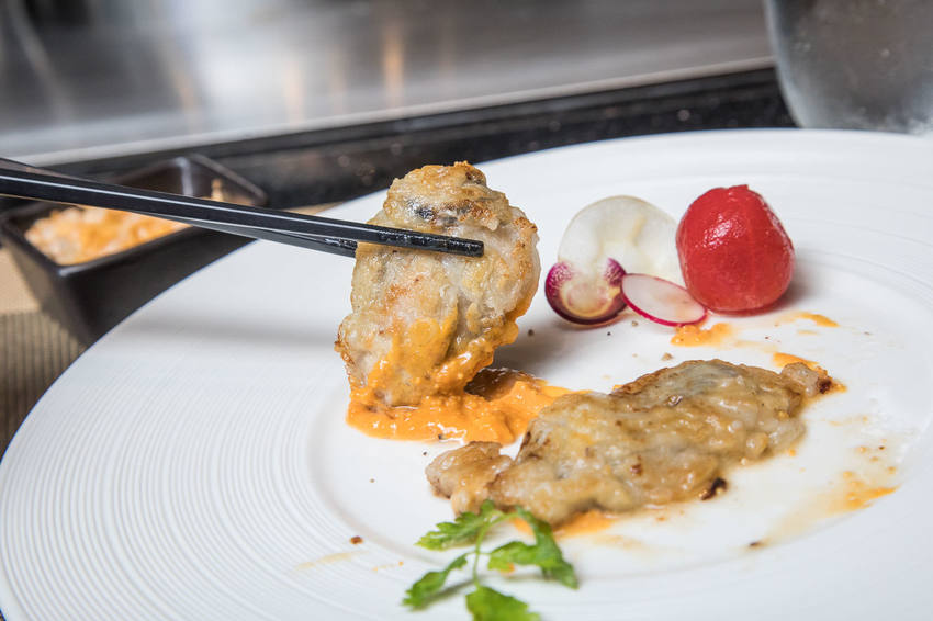 主廚搭配橘黃色的海膽醬,因為外表裹上一層麵粉香煎,牡蠣的水分甜度不流失,海膽醬吃起來有一顆一顆的顆粒肉感,搭配肥美的牡蠣鮮上加鮮