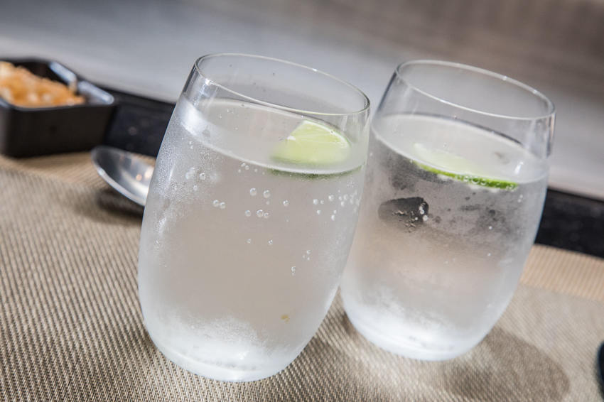 山茶花鐵板燒每人須收取100元的水資,提供進口礦泉水&氣泡水兩種可以選擇,服務生服務相當貼心,用餐期間水杯都是滿的