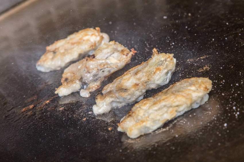 日本廣島牡蠣裹上麵粉後放在鐵板上香煎,灑上岩鹽調味