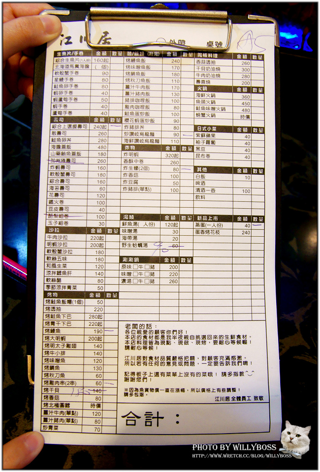 之前就聽說在威尼斯影城後面開了家日式料理江川居,只是一直都忘記抽出時間去嚐鮮看看,某天晚上在SOGO附近閒晃正想著有什麼好吃的時候,走著走著就在巷子裡頭看到江川居,而且生意看起來很好,應該是值得一試!於是二話不說,趕緊進去找位置坐下囉!