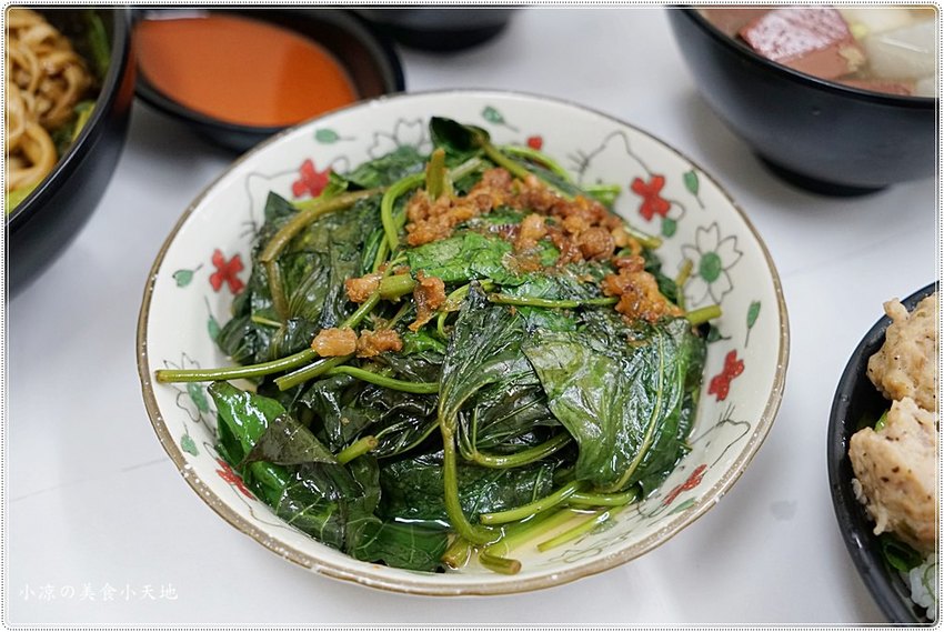 地瓜葉的營養價值備受肯定,稍微的川燙後淋上特製肉燥拌勻