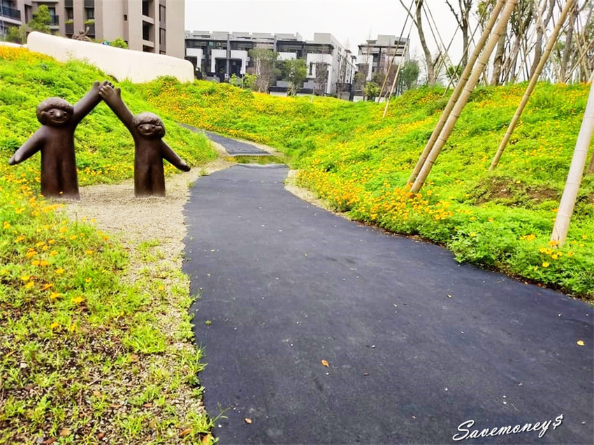 原來山坡上是微笑之丘,有一家三口的雕塑,前面還有二個房屋造型的木框